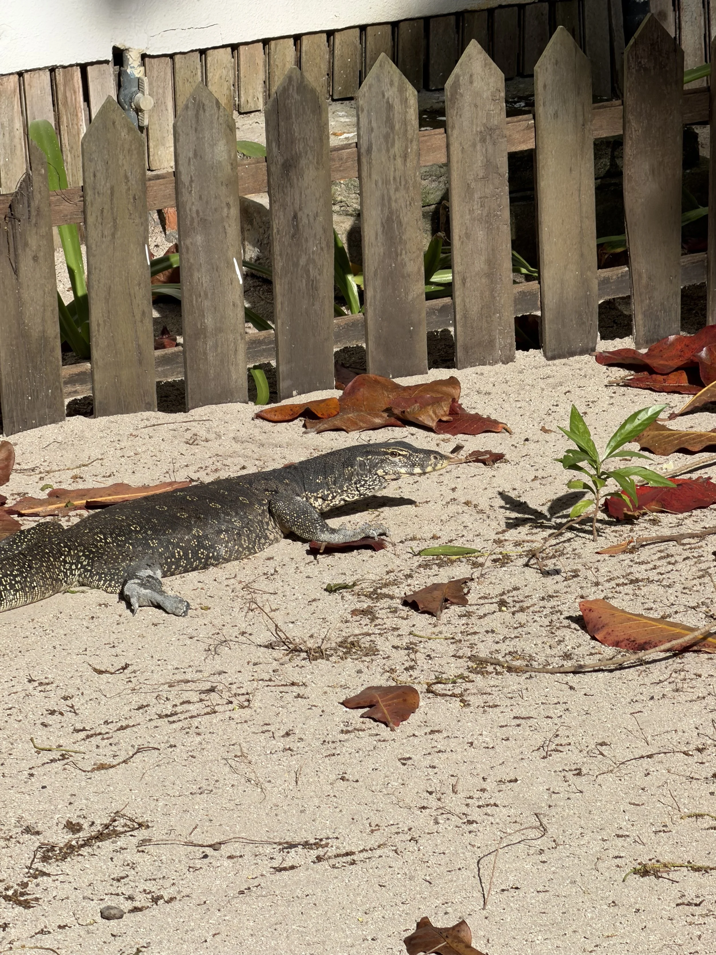 I was met on the end of the jetty by Evan who had been sat in one of the lounge chairs reading. We headed back to the room to debrief & get changed for dinner but were stopped along the way by a dinosaur. In one of the beds behind one of the villas was an Asian Water Monitor Lizard basking in the sun. It had to be at least 4 feet from snout to the tip of its tail. It froze as we walked by, lowering its head to appear more like a log or a rock when I shifted around a tree to get a better look at it. Eventually I let it back to its sunbathing & went about my evening. Evan & I would play “spot the dinosaur” the rest of the week as it popped up almost daily in different locations around the resort.