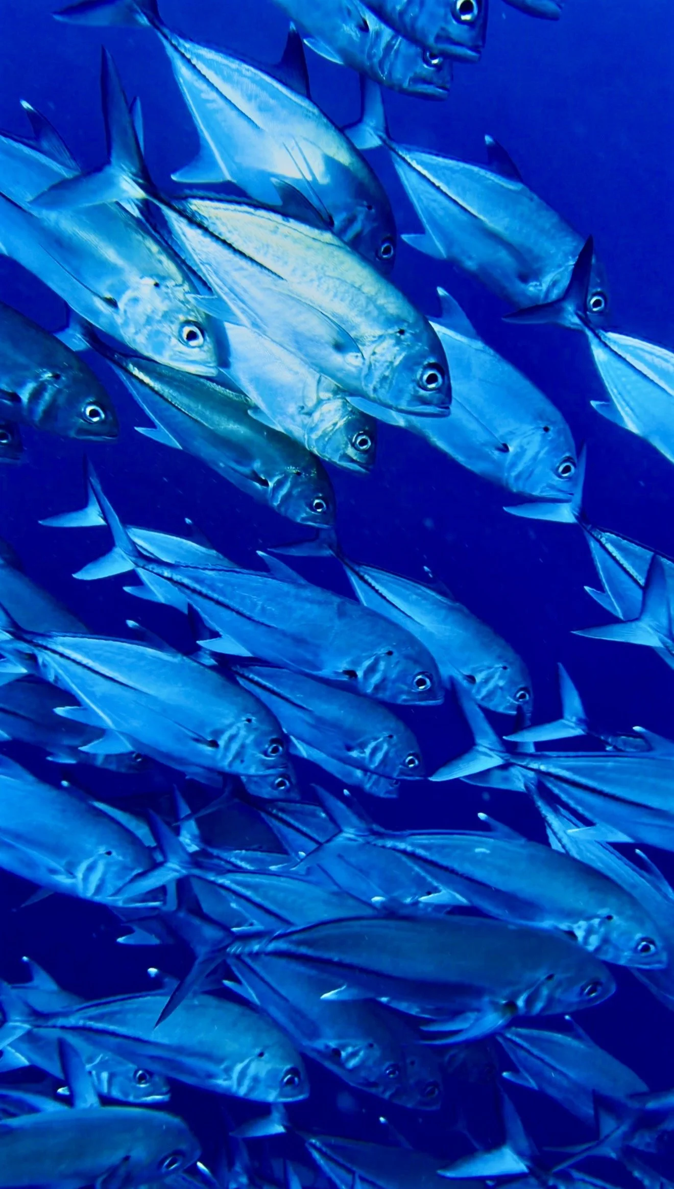 It was a massive school of jacks, they came flying over the top of the reef, down the wall in the hundreds. They were swimming away from the Giant Trevally that were hunting them. Jacks are definitely not the smallest of fish either, so having hundreds of them swim within 5-10 feet of you at full speed is quite the experience.
