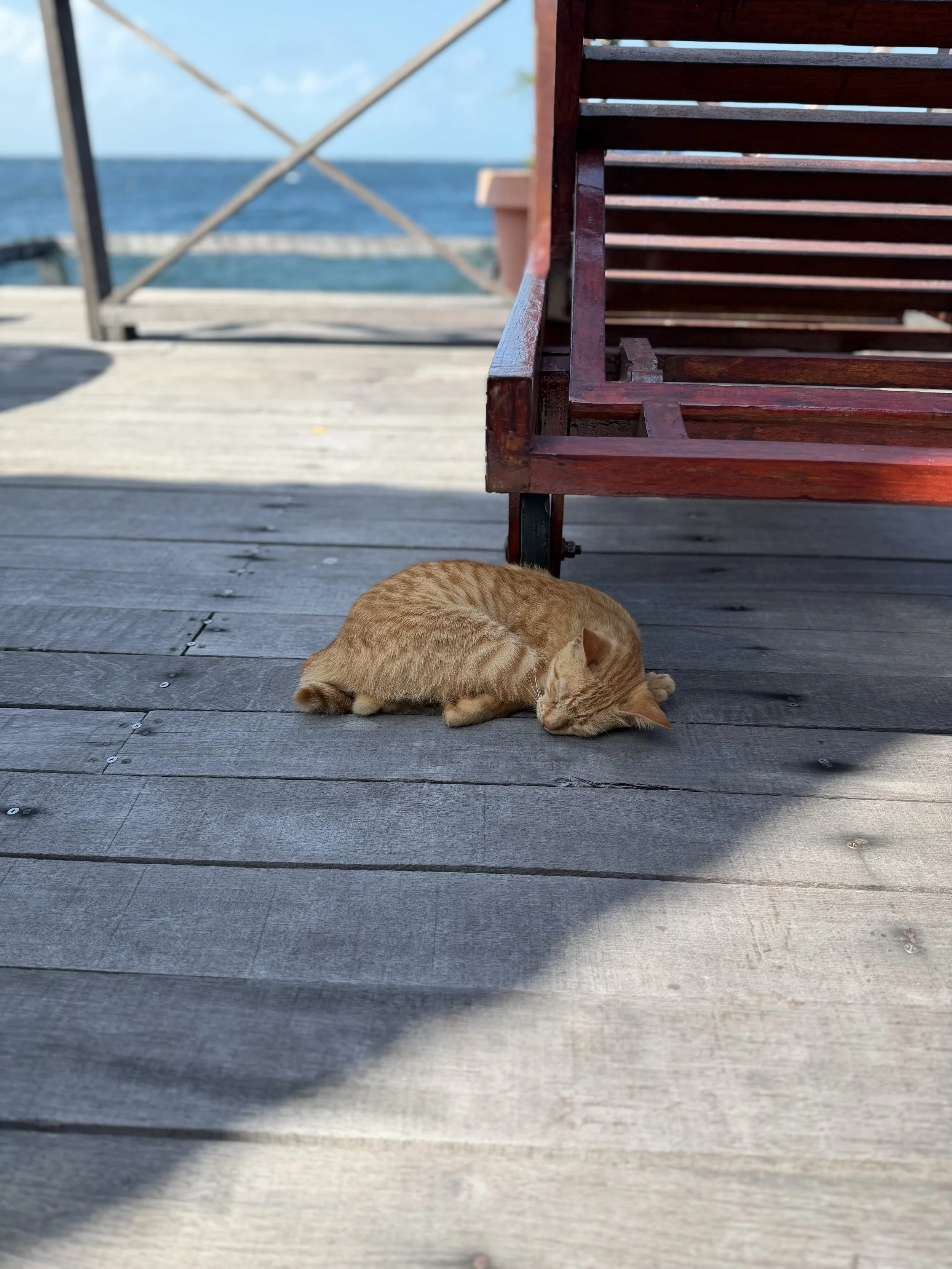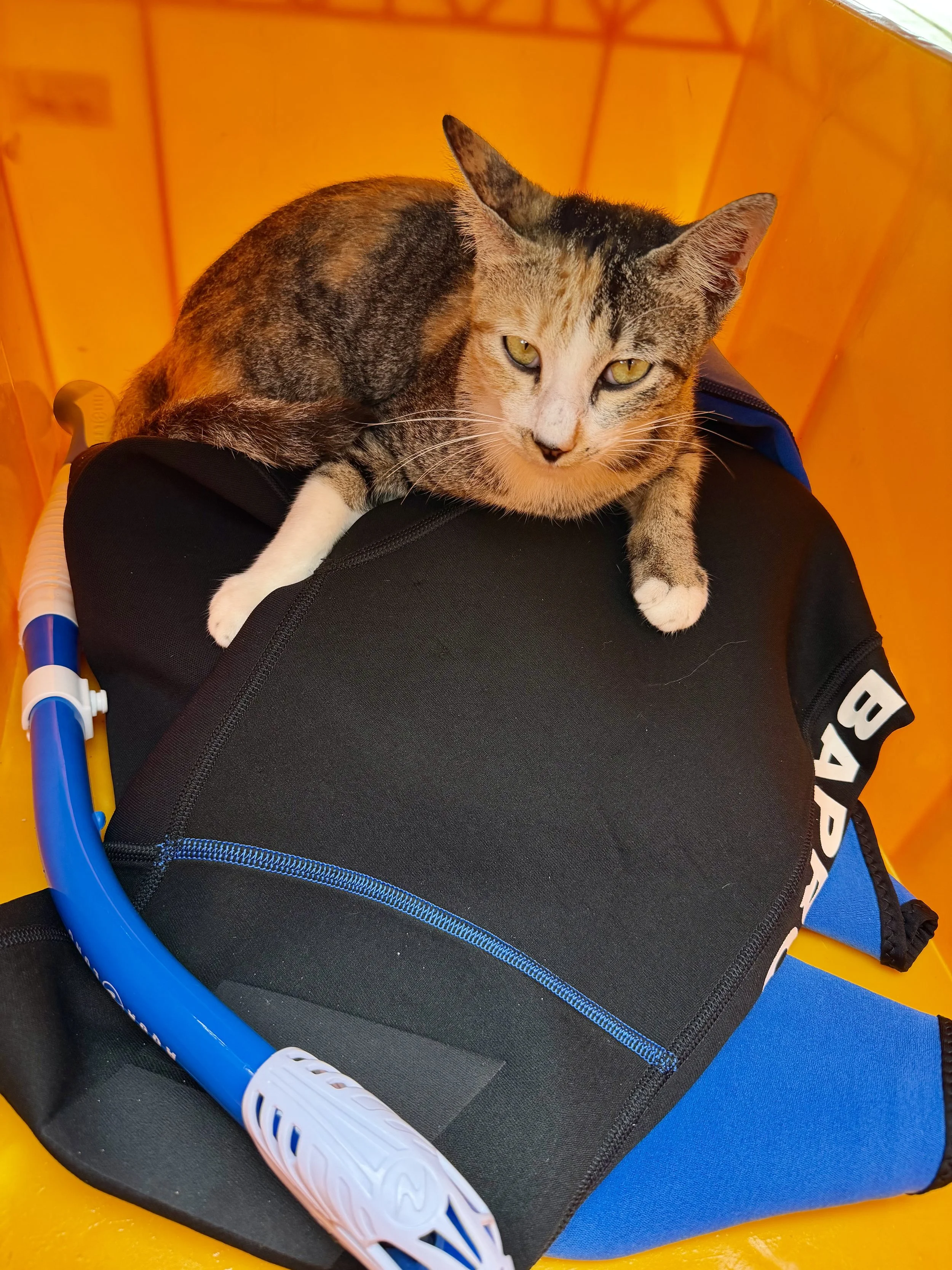 Once our entire group was gathered at the dock we were given our briefing, split into groups, & assigned to our dive guide for the week. Evan, Darin (the owner of Midwest Aquatics), his daughter, our friend Deb, & I were all put into a group with Roy who was the Dive Master of the resort. The crew had come in early to set up our tanks & brought out the dive gear we’d dropped off the afternoon before in totes. Mine came with a small visitor, one of the island cats, she was a stunning mixed calico & tabby & she would spend majority of the next week either following after me or in my lap.
